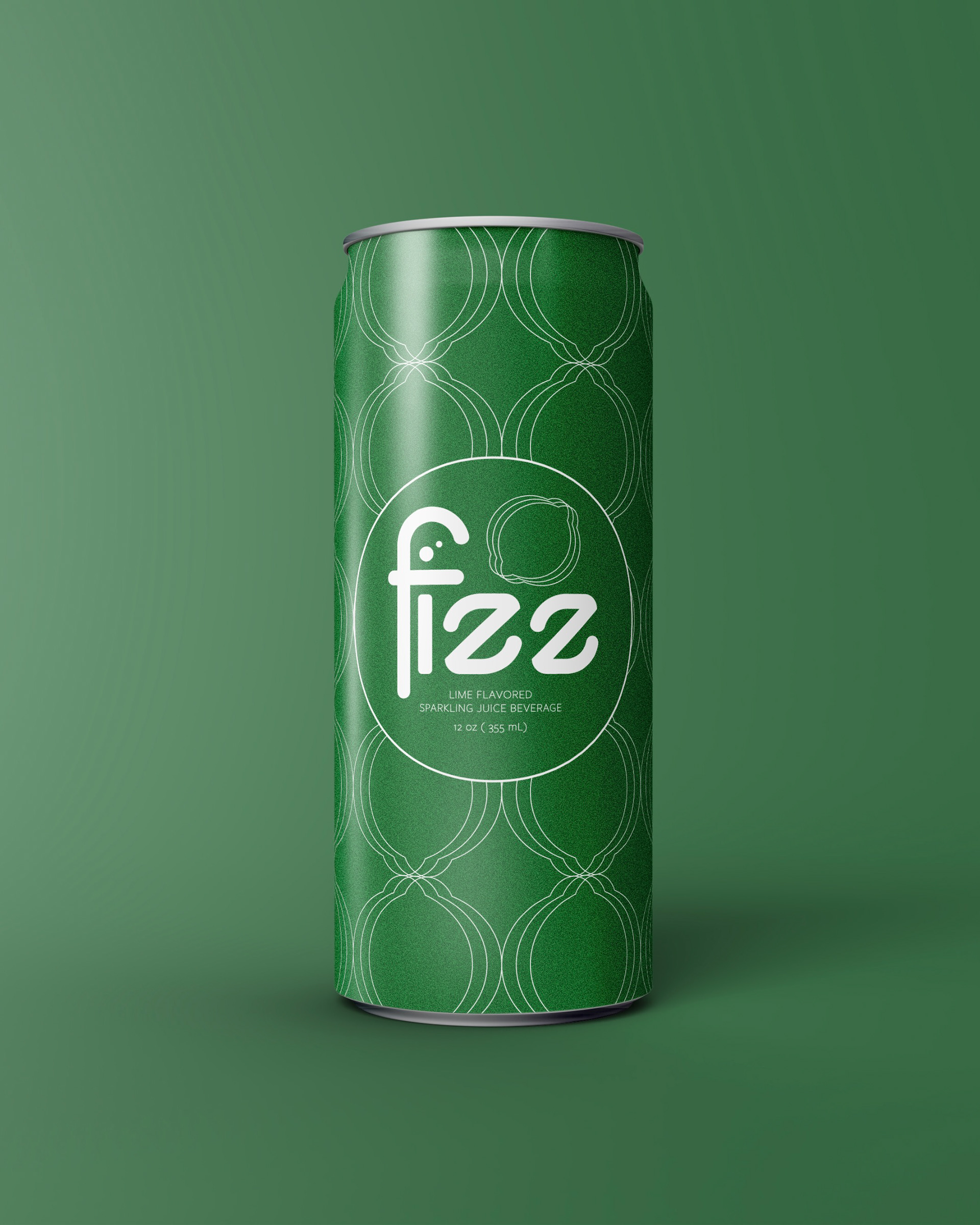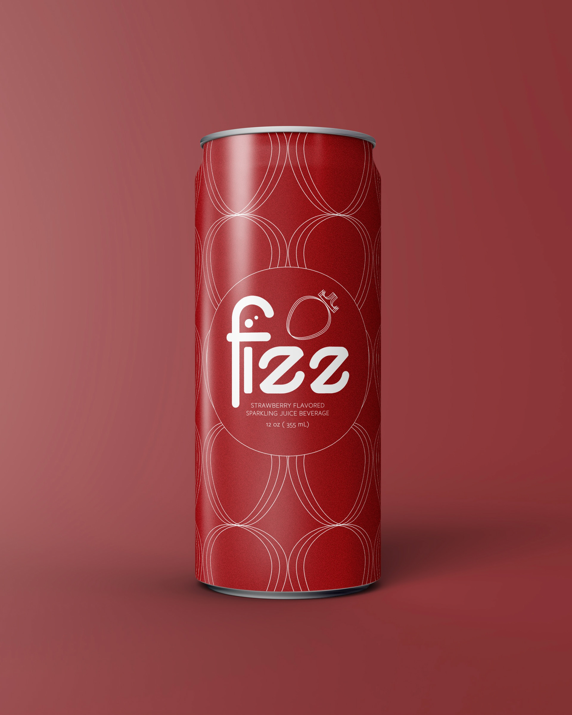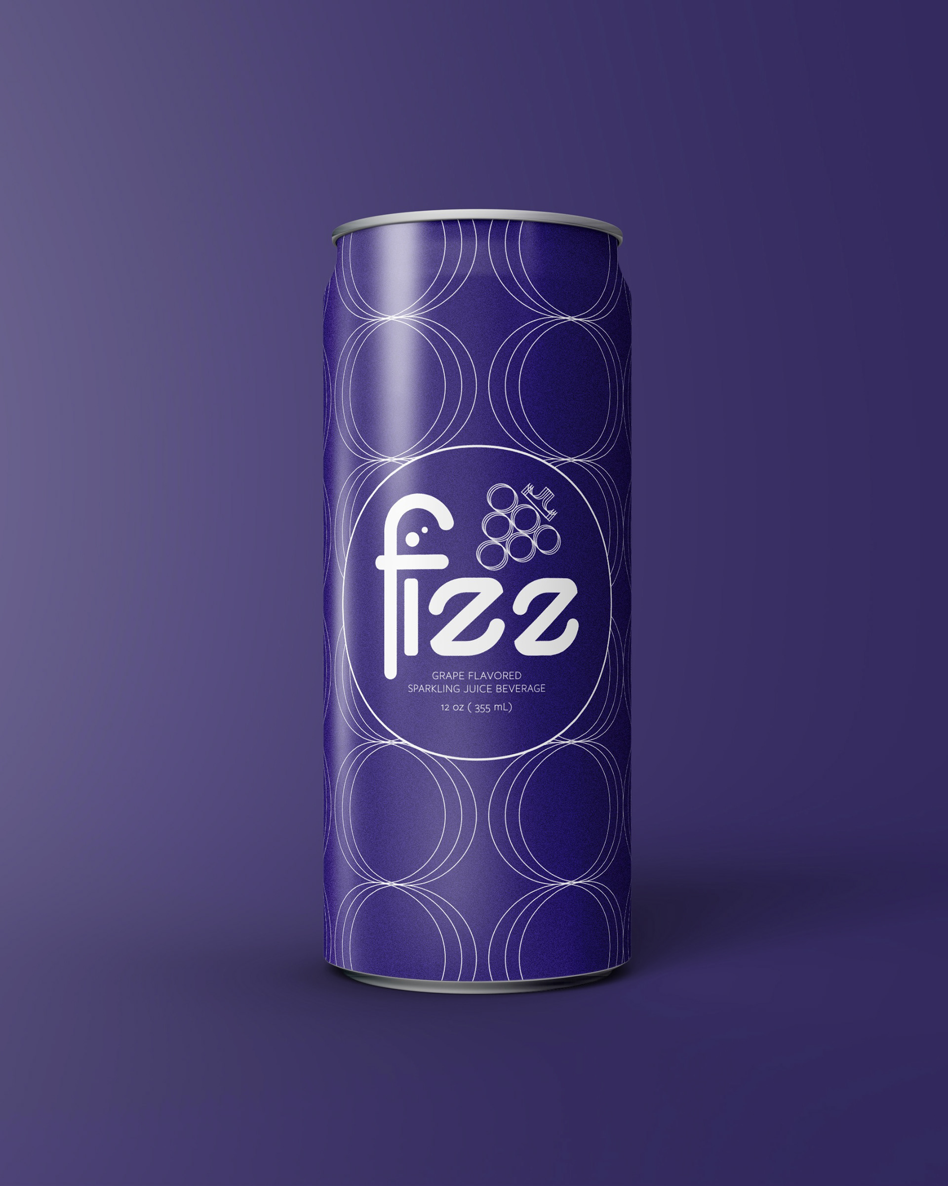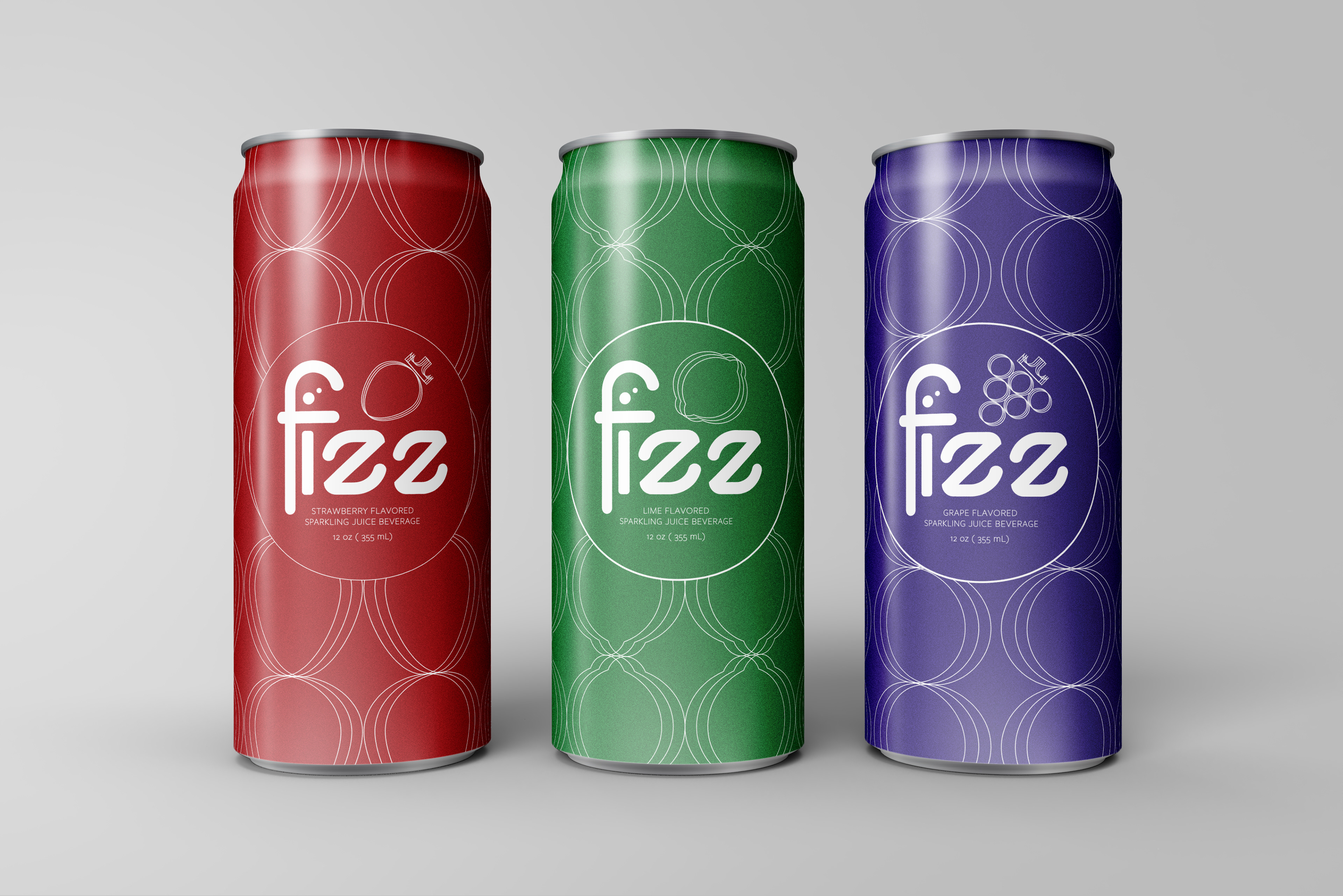 Made with real fruit juice and extra carbonation Fizz is a soda brand designed for people who want a healthy soda option, but don’t want to sacrifice the level of bubbles to get it. The name, logo, and minimal color palette convey a that its a simple soda, that does not have all of the artificial flavoring like most sodas on the market while still having all the flavor. The visual motif throughout the packaging is to indicate the flavor of each can, with a repeating element to communicate the bubbliness.
