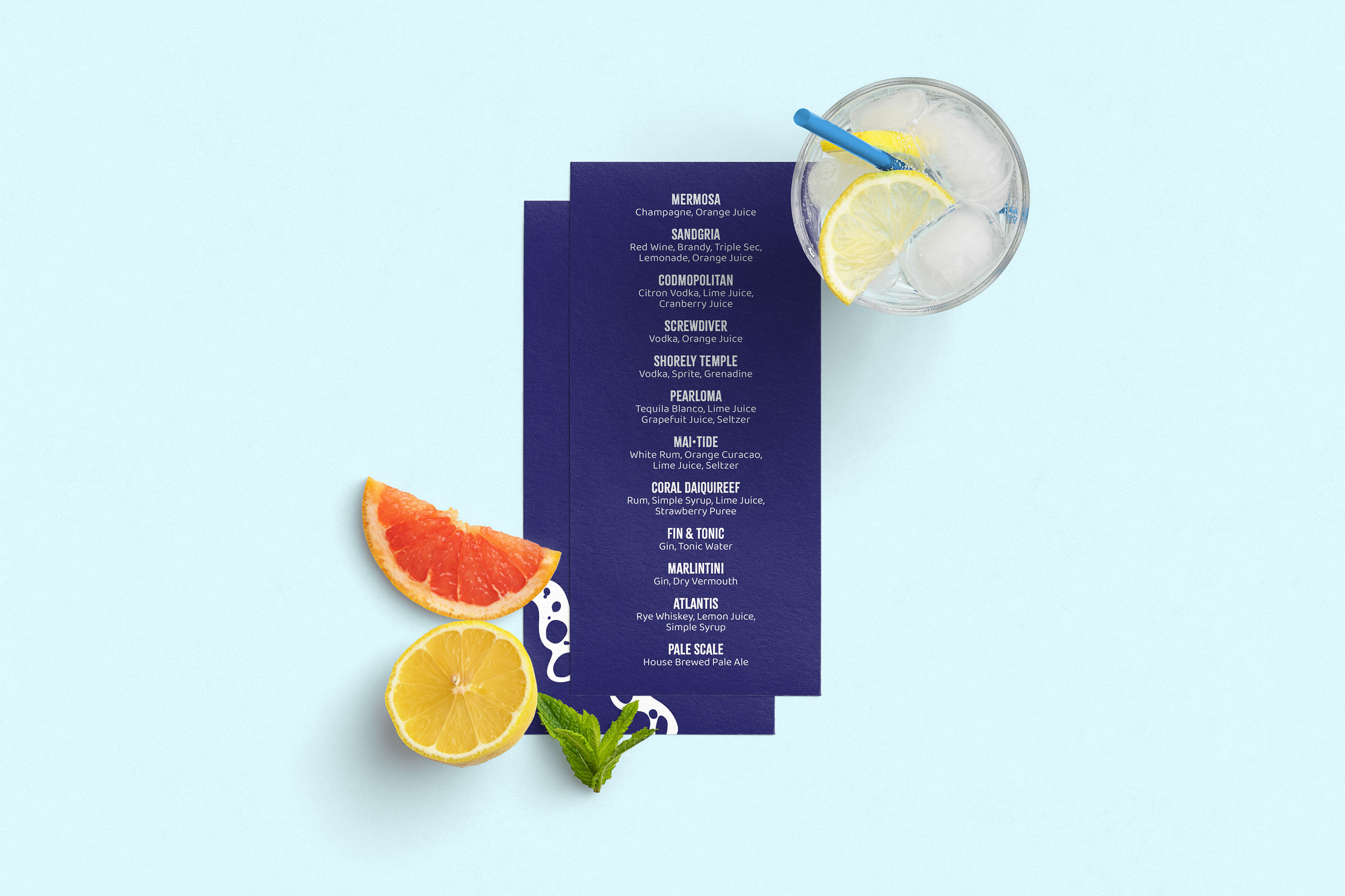 H2belo is an underwater cocktail lounge based in the pacific ocean. My objective for this piece was to develop the front of house supplies that showcased the lounge’s class while still having an element of play. I did this by making my drink menu minimal and primarily dark blue; with a front cover that has a seafoam detail all to relate back to the atmosphere you are in, underwater. Additionally I made coasters that are two layered acrylic with a ripple illustration with one layer that is slightly offset to give a perceived depth to the ripple. Finally I added the logo and the seafoam motif to the glasses to both mimic the ocean and the foam certain drinks get when served. Roles: Brand Identity, Logo Design, Menu Design, Layout Design
