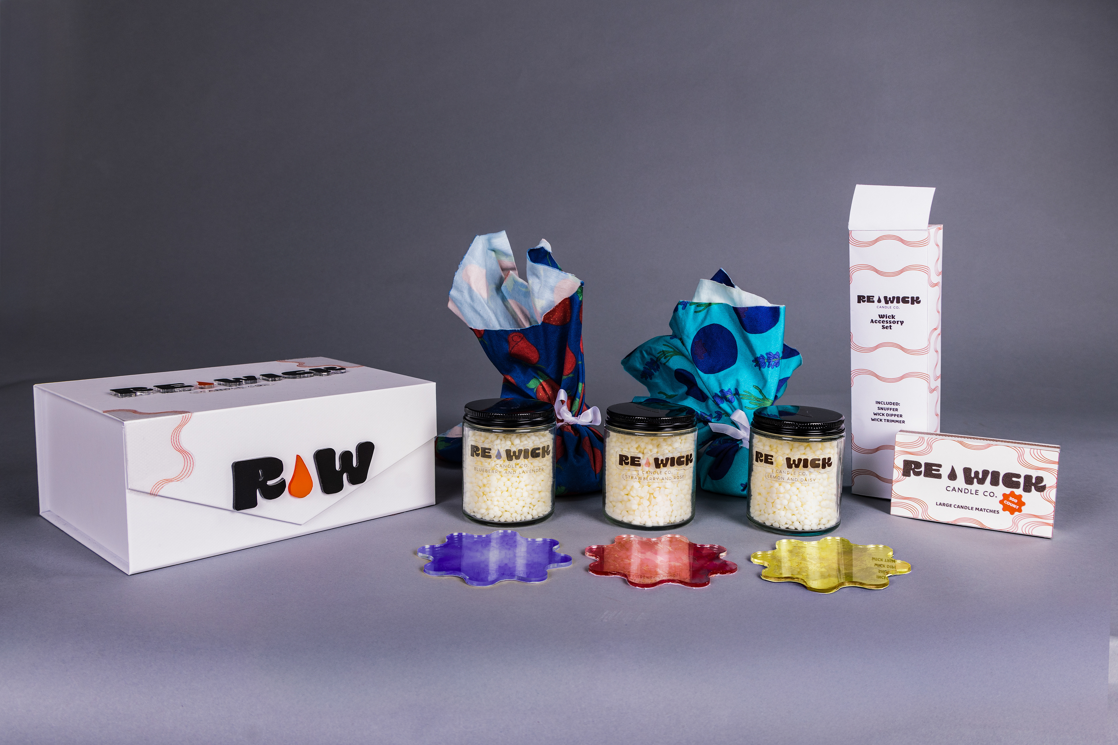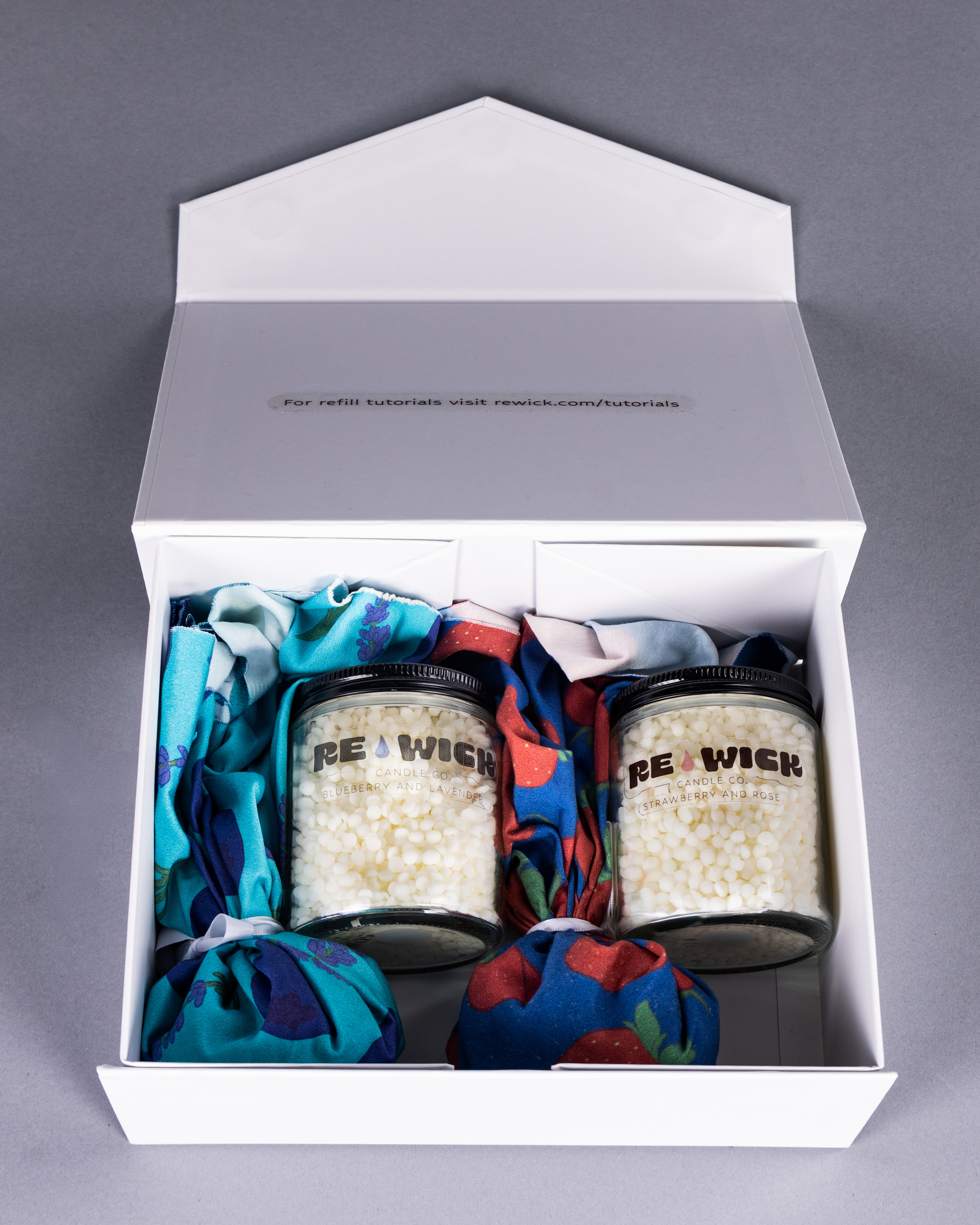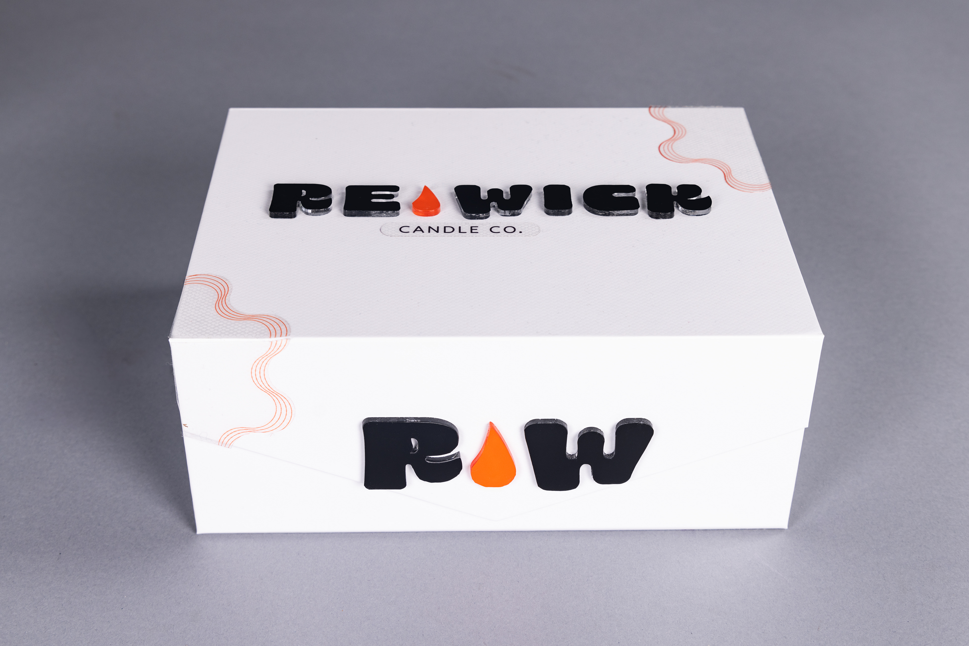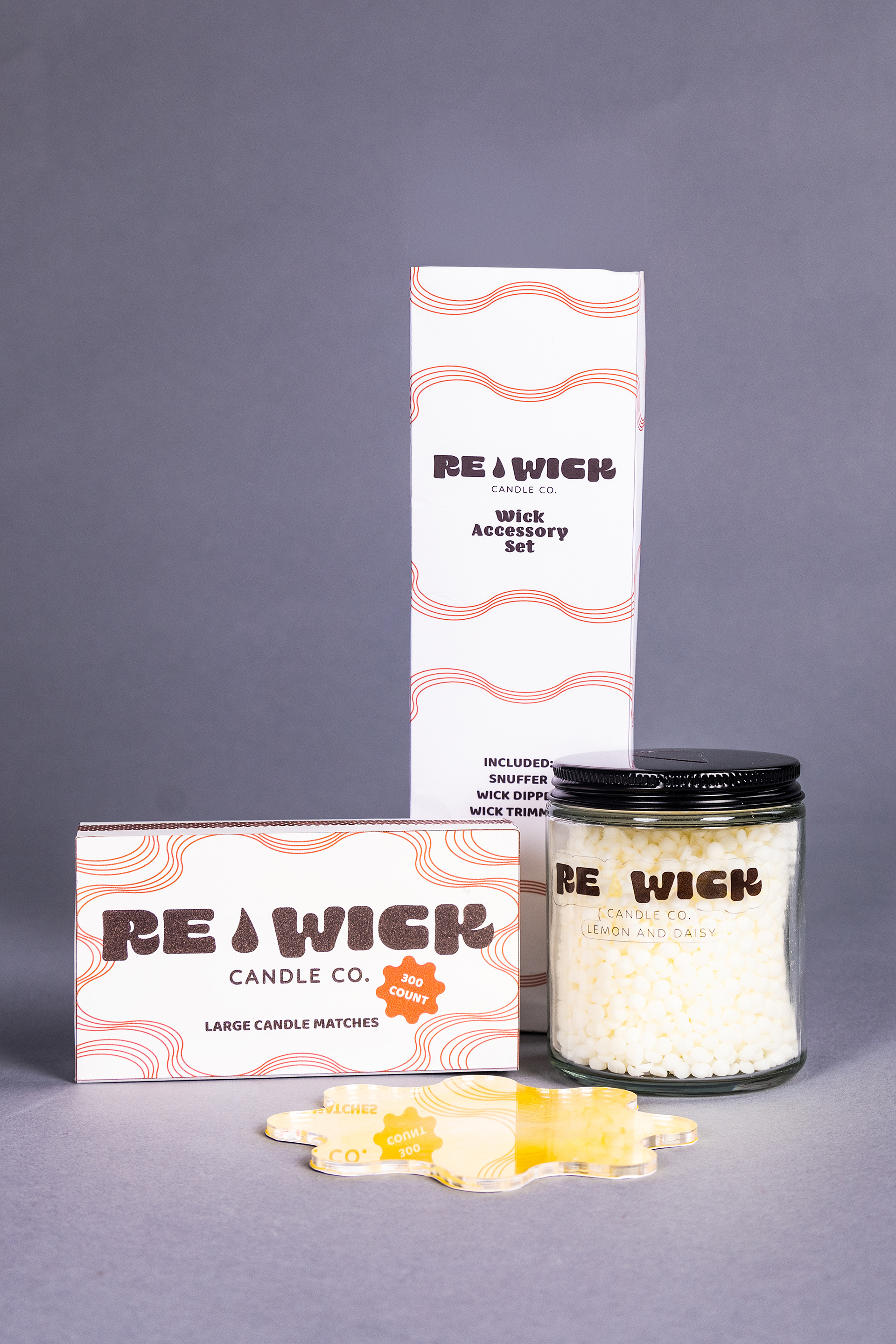 Re•Wick is a candle company that specializes in refillable candles. My objective for this was to develop a brand identity and suite of package designs that achieve company goals of sustainability through multi-purposefulness and a friendly attitude. For this project I designed refills come in sachets, with patterns that reflect the scent inside them. These sachets can then be used as bandanas after using the refill. I also designed a gift box that can contains one of these refill sachets and a starter candle of the same scent. Additionally I designed a box for accessories and for matches. Roles: Concept Development, Logo Design, Packaging Design, Brand Identity